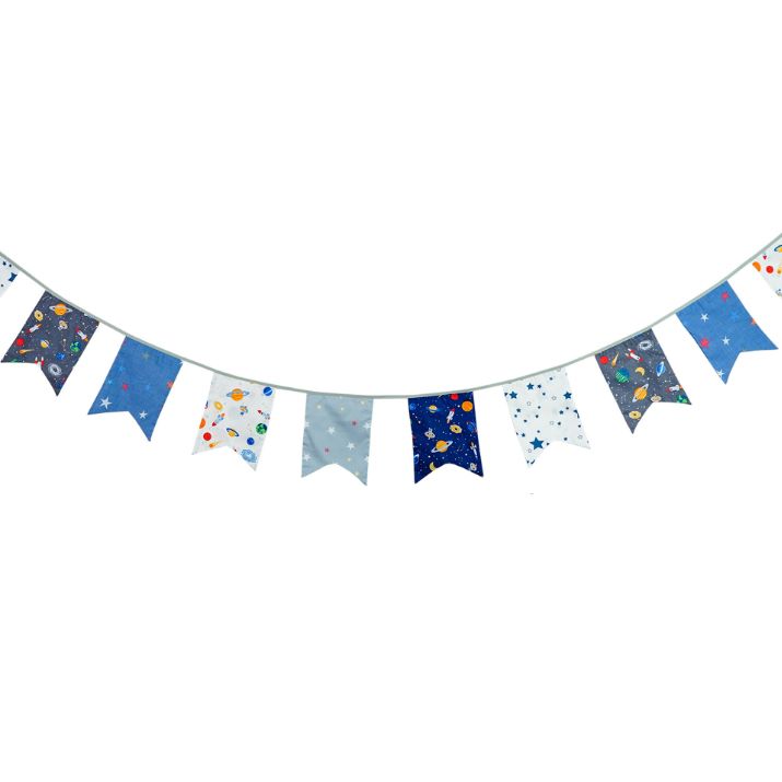 Гирлянда состоит из 12 флажков, общая длина составляет 3,4 м, расстояние между флажками 3 см, длина матерчатых флажков 2,1 м, длина лямок с обеих сторон по 50 см