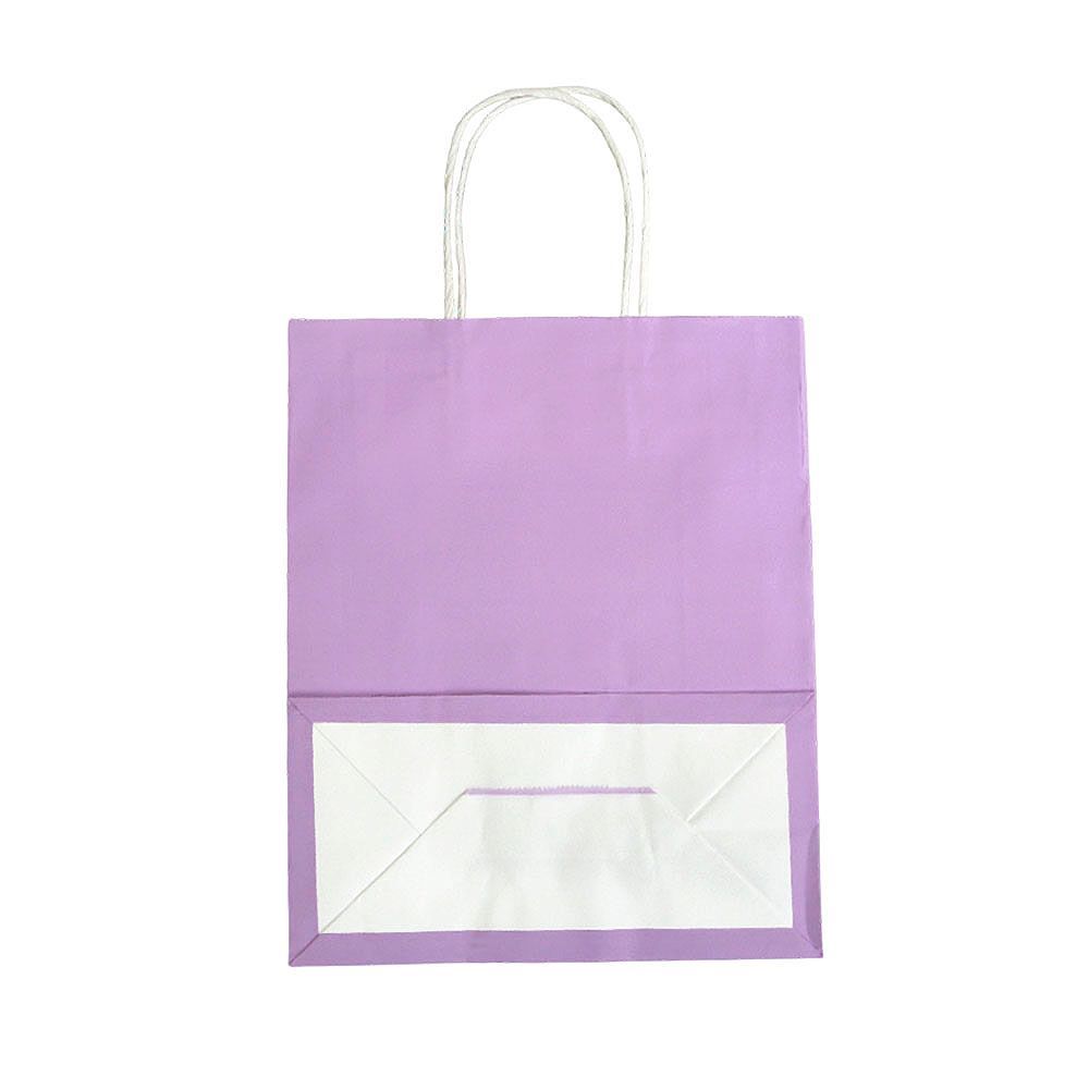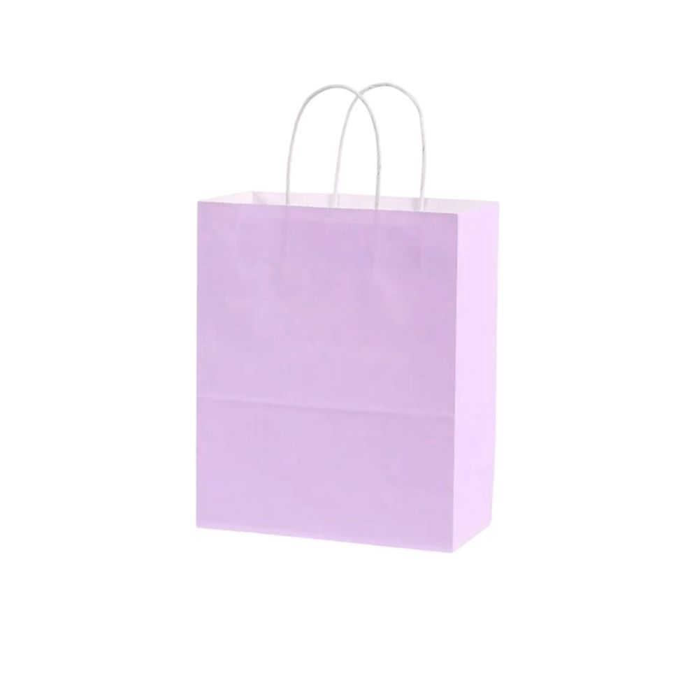 Подарочный пакет из крафтовой бумаги пастельного оттенка с белыми бумажными ручками и белой внутренней стороной.