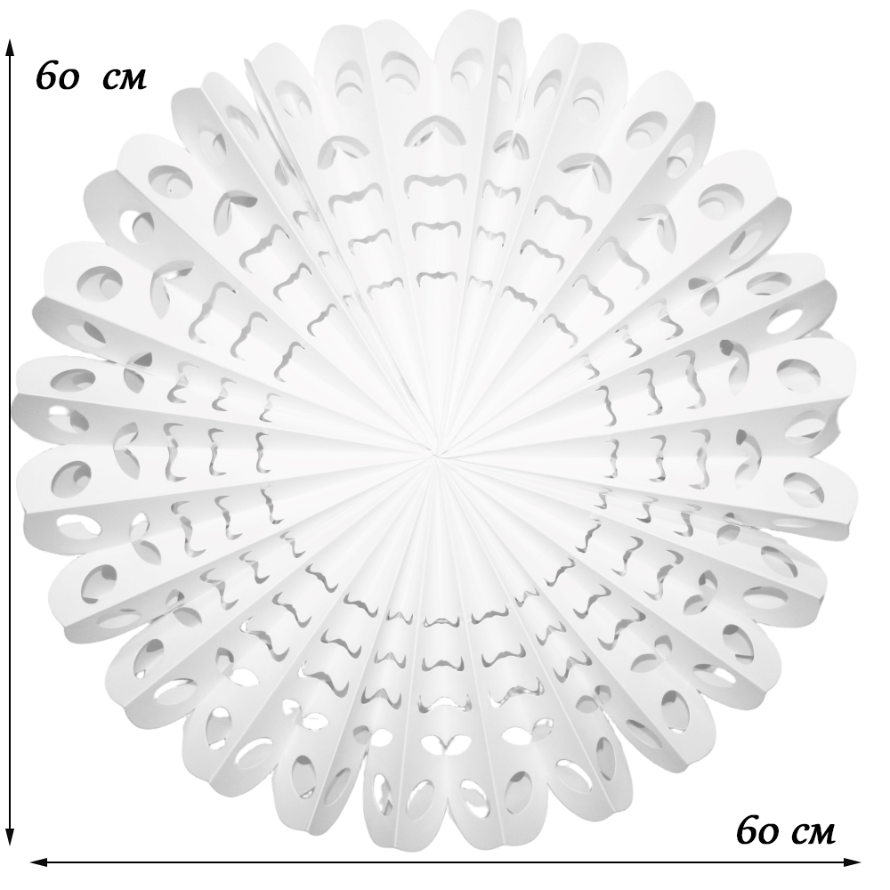 Снежинка на липучках размером 60 см, белого цвета, изготовлена из высококачественной бумаги.